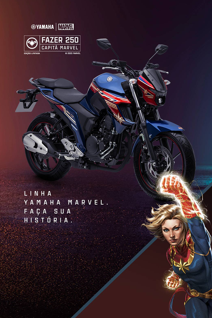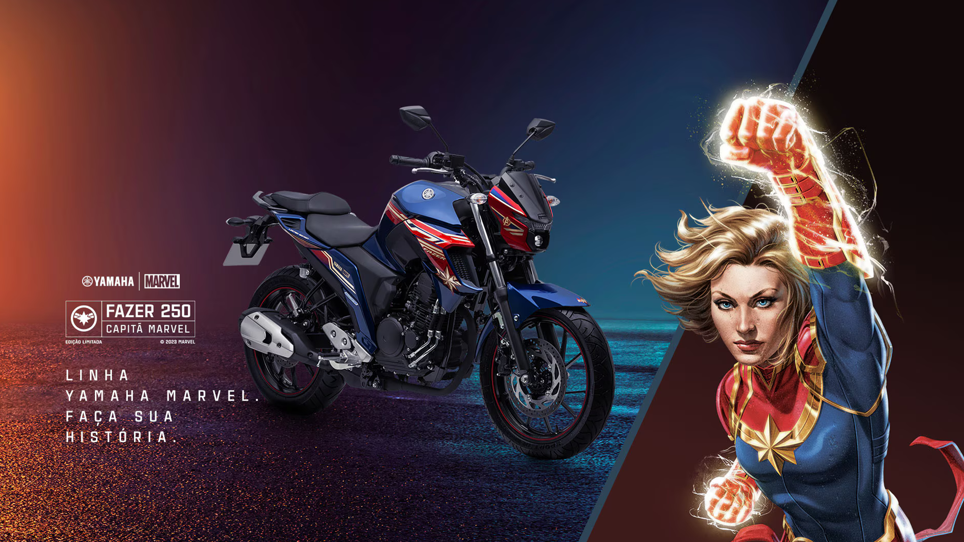 A Fazer FZ25 ABS Capitã Marvel voltou mais poderosa do que antes. Além de combinar a potência genuína Yamaha com grafismos inspirados no uniforme da Vingadora mais poderosa, a edição conta com easter eggs que prometem acelerar os corações de todos que acompanharam essa parceria icônica.